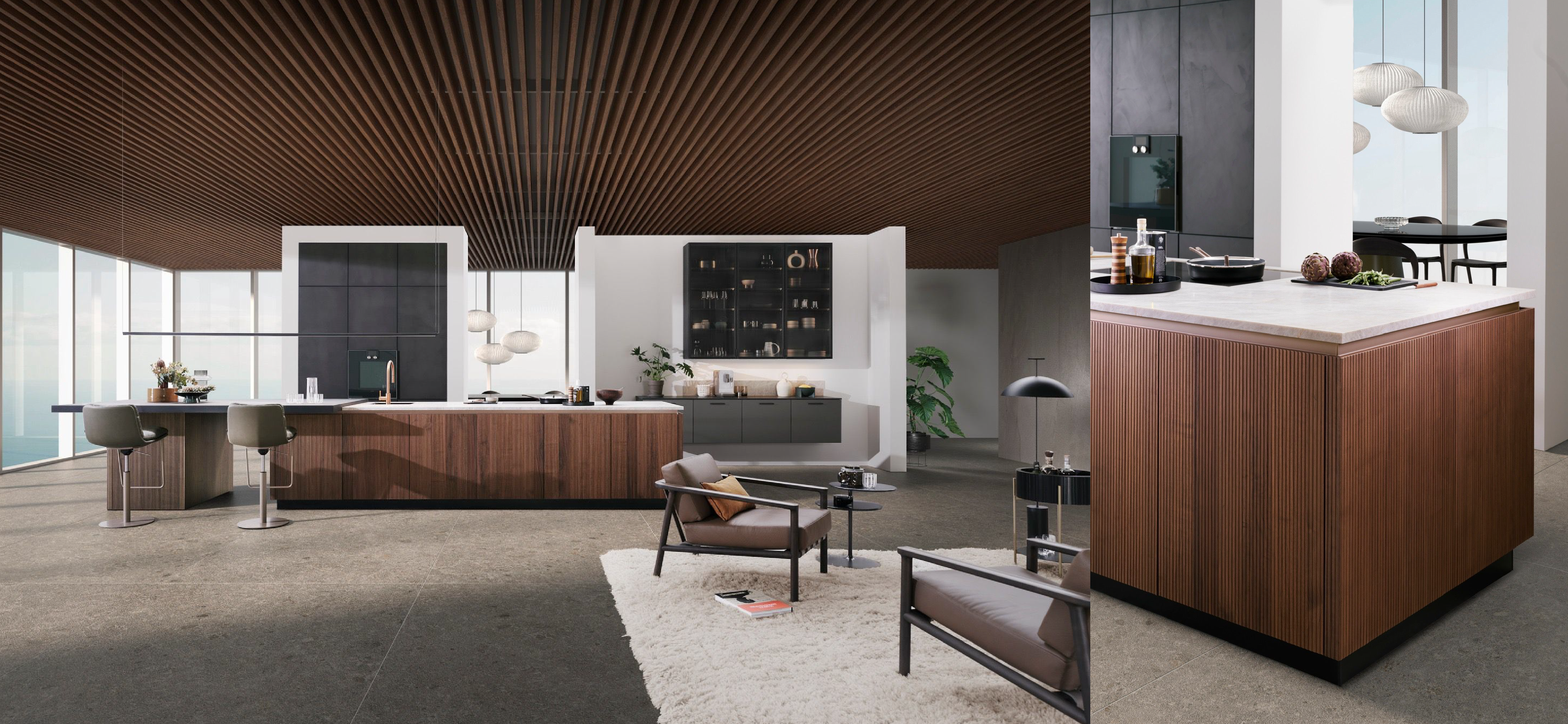 שילוב חדשני ומרתק: ארונות קיר בחזיתות בטון גרפיט, ואי מטבח מחופה סרגלי עץ אופנתיים.